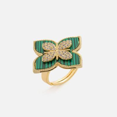- التفاصيل: خاتم بتصميم حلية بشكل وردة بلون أخضر مرصعه بعدد من فصوص الزركون اللامع