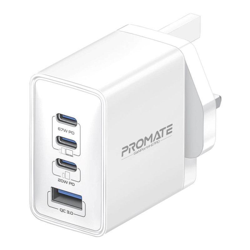 منفذ USB Qualcomm 3.0 للشحن السريع بقوة 22.5 واط متوافق مع USB:يحتوي شاحن Promate GaNPort4-67PD على منفذ QC 3.0 يوفر طاقة تصل إلى 22.5 واط، مما يتيح لك شحن مجموعة متنوعة من الهواتف الذكية والأجهزة اللوحية بسرعة. تقنية Quick Charge 3.0 تتيح شحن الأجهزة المتوافقة بنسبة تصل إلى 80% في 35 دقيقة فقط، وهو أسرع بأربع مرات من الشواحن التقليدية.