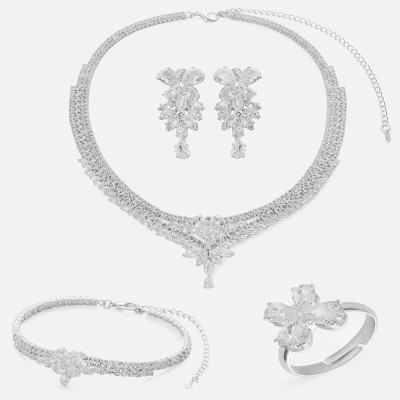 - يتميز الطقم بتصميمه الذي يتزين بحلي متدلية مرصعة بفصوص و أحجار من الزركون اللامع