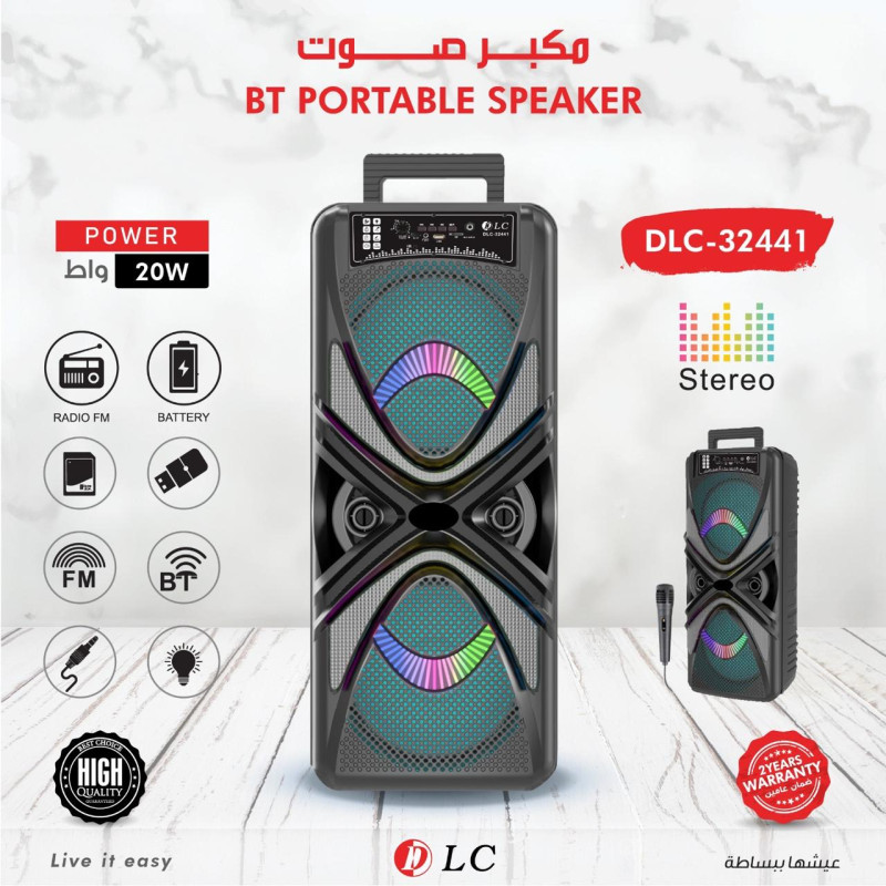 يعمل بالبطارية ويأتي بخزانة بلاستيكية متينة، يدعم التشغيل عبر USB وAUX، ويحتوي على ميكروفون وراديو FM وتقنية TWS للربط اللاسلكي.