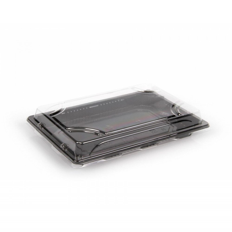 صحن سوشي اسود الراشد-رقم7020* ك×4ربطة×115حبة , صحن بلاستيك لون اسود بغطاء شفاف يستخدم للسوشي والكوكيز والحلويات .