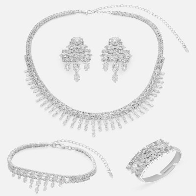 - يتميز الطقم بتصميمه الذي يتزين بحلي متدلية مرصعة بفصوص و أحجار من الزركون اللامع