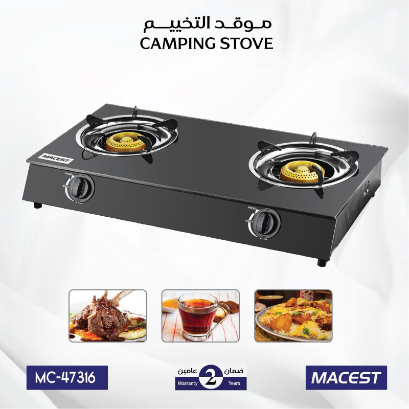 موقد غاز مسطح بشعلتين من الزجاج المقوى – أسود