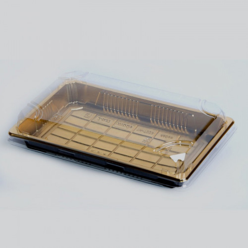صحن سوشي ذهبي الراشد-رقم7023* ك×4ربطة×80حبة , صحن بلاستيك لون ذهبي بغطاء شفاف يستخدم للسوشي والكوكيز والحلويات .
