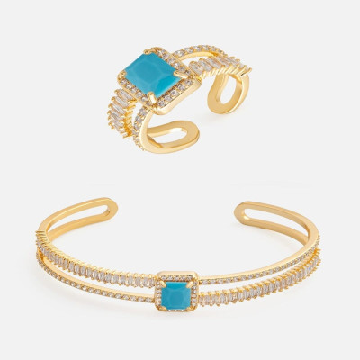 - يتميز الطقم بتصميم مرصع بفصوص الزركون البراقة وبحجر زركون بارز فالمنتصف بشكل مربع بلون أزرق يكمل اطلالتك بأناقة