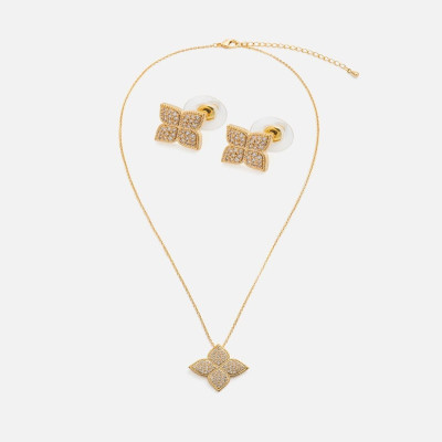 - يتميز الطقم بتصميم حلية بشكل ورود مرصعة بفصوص الزركون البراقة تضفي لمسة من الجاذبية