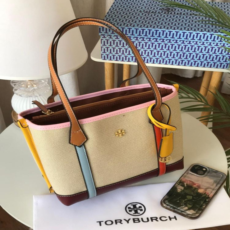 شنطة توري بورش بألوان جريئة وجميلة، مزيج بين القماش البيج الفاخر وجلد ملون بأطراف متعددة (أصفر، عنابي، وردي، أزرق، وبرتقالي). تصميم أنيق وعصري يناسب الطلعات اليومية والمناسبات الخفيفة، وتجي مع سير كتف طويل قابل للفك.