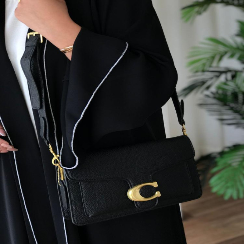 تميّزي بإطلالة راقية مع شنطة كوتش تابي COACH طبق الأصل باللون الأسود المطفي الكلاسيكي وتصميم أنيق بلمسة عصرية. مصنوعة من جلد فاخر محبب وتفاصيل معدنية ذهبية جذابة مع حرف “C” الأيقوني. تأتي بحزامين لتناسب جميع الأذواق والمناسبات.