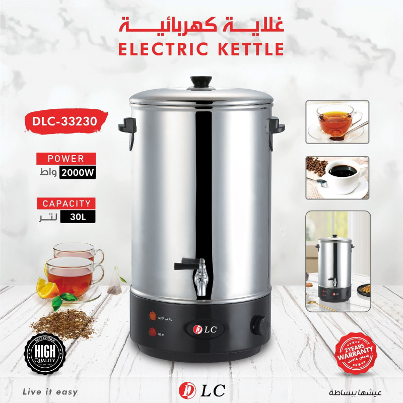وصف المنتج:استمتع بتسخين كميات كبيرة من الماء بسهولة وسرعة مع غلاية LC الكهربائية بسعة ضخمة تصل إلى 30 لتر.تتميز الغلاية بهيكل متين من الستانلس ستيل المقاوم للصدأ يضمن أداءً طويل الأمد ونظافة مثالية.تعمل بقدرة 2000 واط لتسخين سريع وكفاءة عالية، كما تحتوي على مفتاح للتحكم بالحرارة ووظيفة الحفاظ على السخونة لضمان جاهزية الماء في أي وقت.مثالية للاستخدام في المناسبات، المطاعم، المقاهي، أو المكاتب.