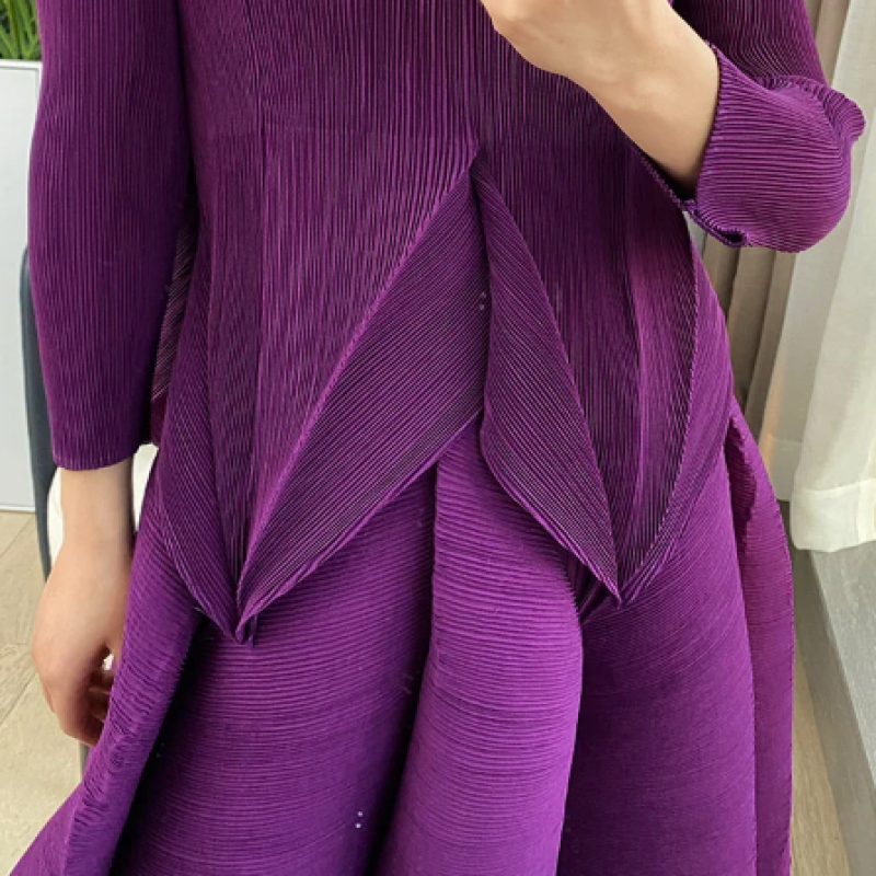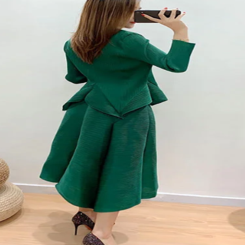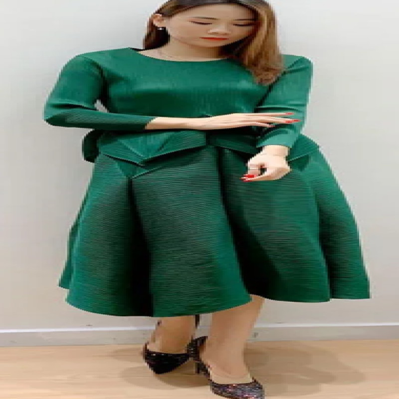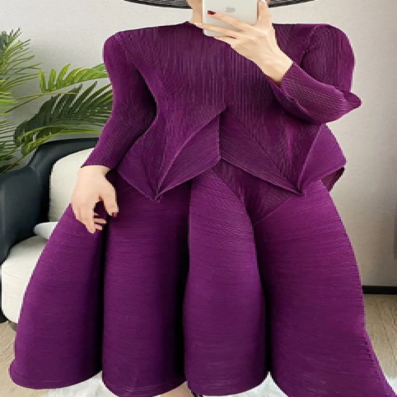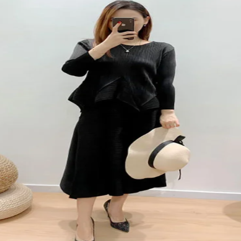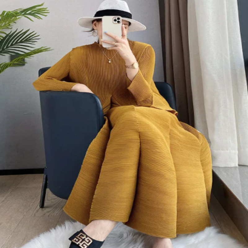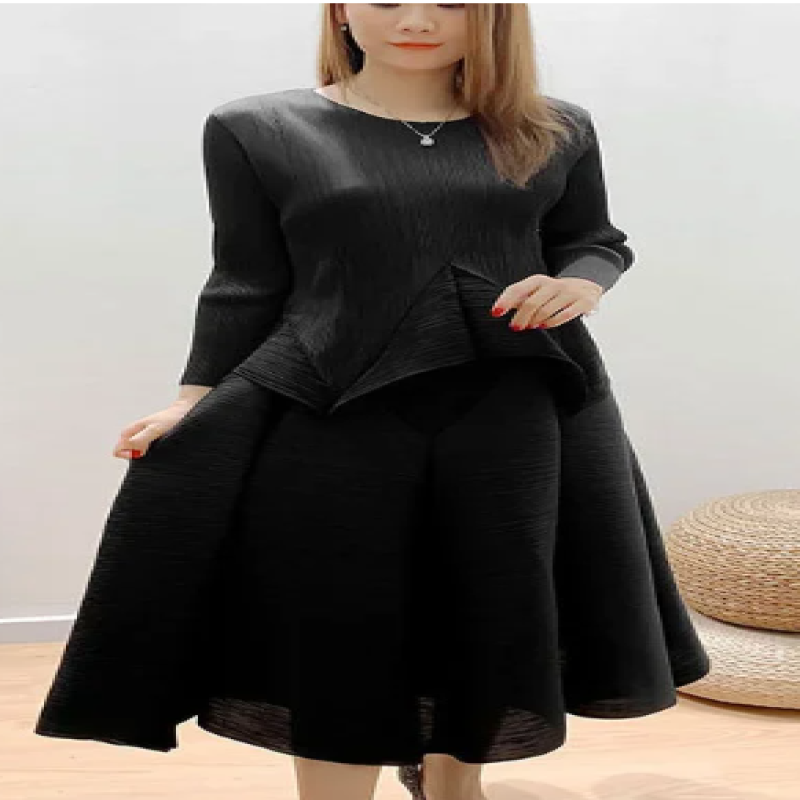 بدلة نسائية موضة صيف 2025 من Miyake (مناسب للجميع المقاسات) بلون سادة ورقبة دائرية وأكمام طويلة تنورة بوستير عالية الخصر بطيات من قطعتين