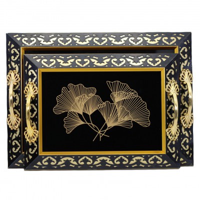 طقم تباسي خشب 2 حبة اسود: طقم طوافير للتقديم مكون من قطعتين بشكل مستطيل الحجم: كبير, وسط مصنوعه من الخشب اللون أسود مشجر بذهبي