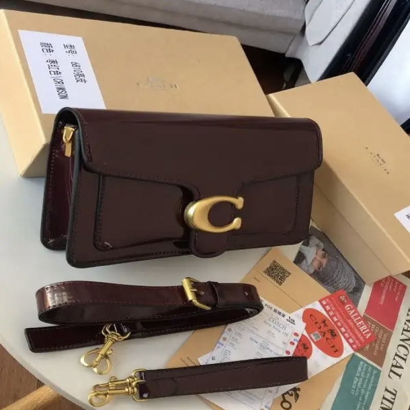 شنطة كوتش تابي COACH طبق الأصل بلون بني غامق لامع، تصميم أنيق بخامة جلدية فاخرة ولمعة مميزة تضيف لمسة فخامة لإطلالتك. مزودة بإغلاق مغناطيسي بحرف “C” الذهبي الشهير، مع حزام قابل للتعديل لتناسب جميع الأوقات.