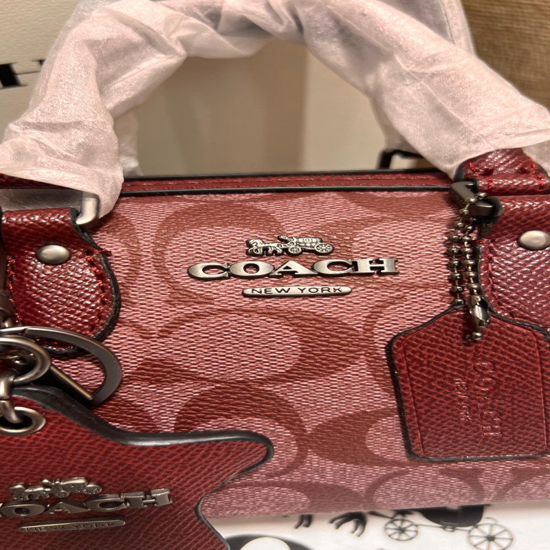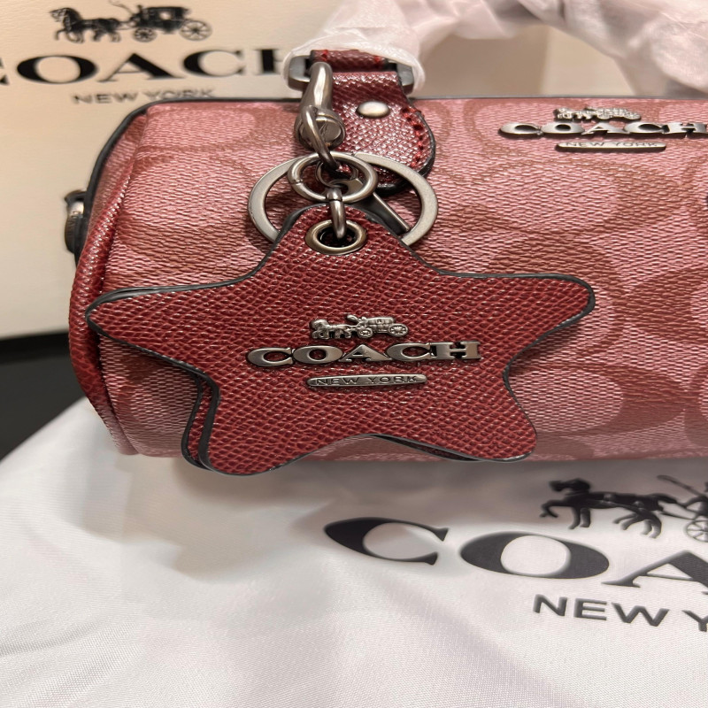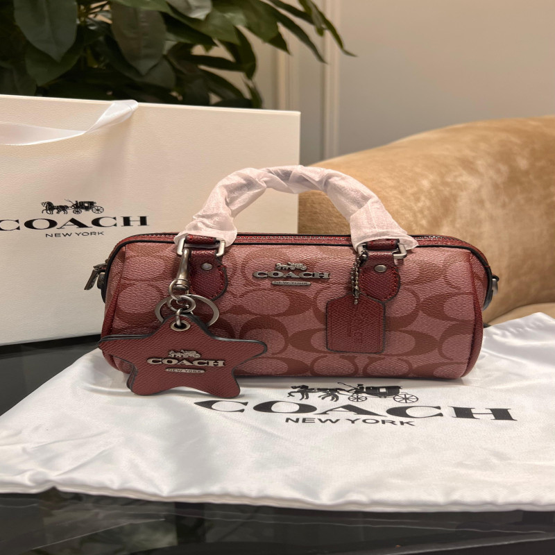 شنطة كوتش COACH طبق الأصل بحجم ميني صغير بتصميم عصري عملي، بلون بورغندي فاخر ونقشة الشعار الكلاسيكية. مزوّدة بيد علوية أنيقة وتعليقة نجمة تحمل شعار COACH لإطلالة مرحة ومميزة. مثالية للاستخدام اليومي أو الطلعات السريعة.