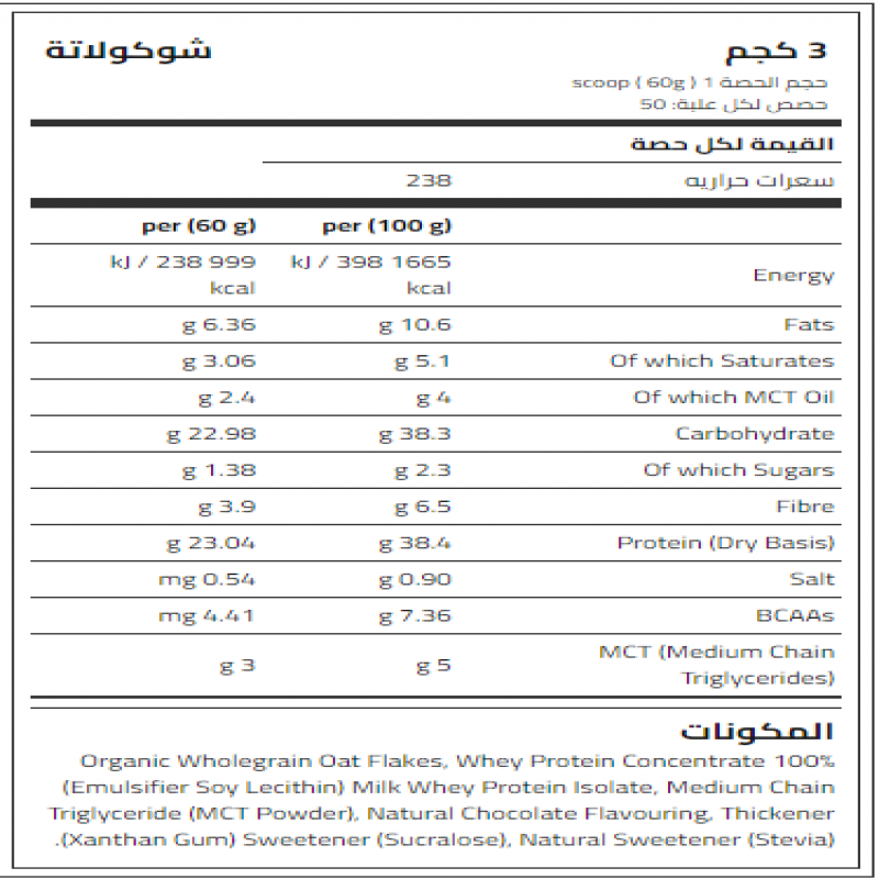 المكونات: 100٪ رقائق شوفان عضوية كاملة، بروتين مصل الحليب المركز، ليسيثين الصويا (مستطب)، بروتين مصل الحليب المعزول، متوسطة الدهون الثلاثية (بودرة ام سي تي)، مسحوق الكاكاو، نكهة الشوكولاتة الطبيعية، زنتان الصمغ (منشن)، محلي سوكر الوسي)، محلي طبيعي (ستيفيا) كمية المحليات (ملغ/كلغ): سوکرالوز 15، ستيفيا 45.