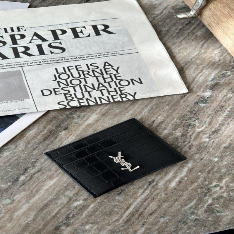 محفظة عملية وأنيقة باللون الأسود مع نقشة جلد كروكو فاخرة وشعار YSL المعدني الفضي في الواجهة.