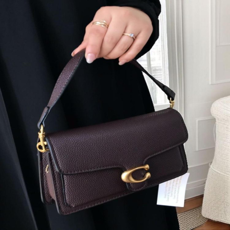 شنطة كوتش تابي COACH طبق الأصل بلون بني داكن أنيق، مصنوعة من جلد فاخر محبب بجودة عالية، تصميم راقي وعملي للإطلالات اليومية والمناسبات. مزودة بإغلاق مغناطيسي بحرف “C” الذهبي الأيقوني، وحزام طويل قابل للتعديل.