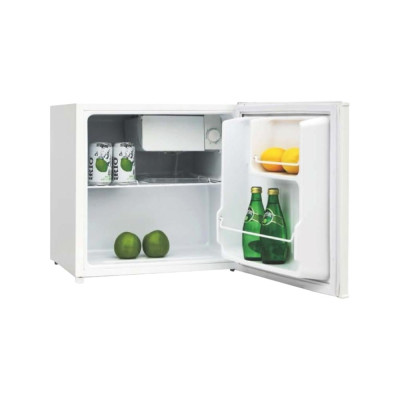 ثلاجة صغيرة الحجم ومدمجة، مثالية للمساحات الصغيرة مثل غرف النوم، المكاتب، أو الشقق الفندقية. تتميز بتصميمها الأنيق باللون الأبيض، مع باب يفتح ليظهر مساحة داخلية منظمة. يمكنها حفظ المشروبات والأطعمة الخفيفة بسهولة.
