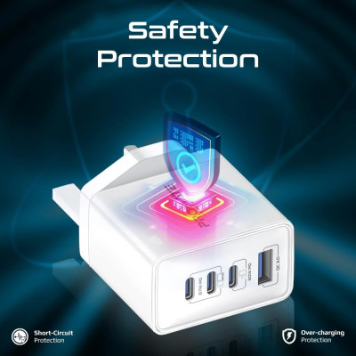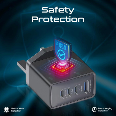 شاحن GaNPort4-67PD يوفر أقصى درجات الأمان بفضل ميزات حماية متكاملة. يقوم الشاحن بتعديل توصيل الطاقة تلقائيًا ليتوافق مع متطلبات كل جهاز، مما يضمن سرعة شحن آمنة. تشمل تقنيات الأمان أيضًا التحكم في درجة الحرارة، حماية من التيار الزائد، والحماية من ماس كهربائي، مما يحافظ على أجهزتك بأمان أثناء الشحن.