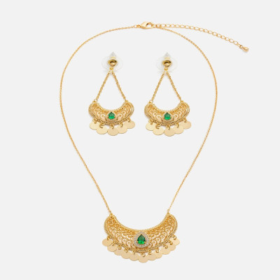 - يتميز الطقم بتصميم حلية بشكل مميز مرصعة بفصوص الزركون البراقة بلون أخضر تضفي لمسة من الجاذبية