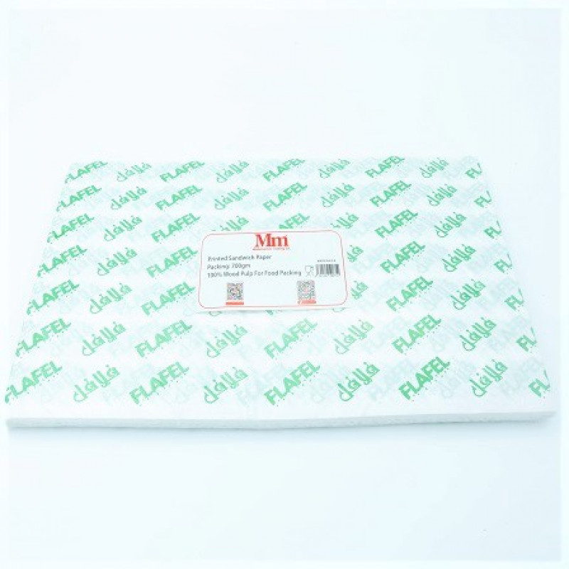 ورق ساندوتش مطبوع على الورقه فلال و FLAFEL مادة الصنع: الورق. المقاس: الطول 35سم العرض 25سم الكمية تحتوي على 300 قطعه. كرتون شد 8