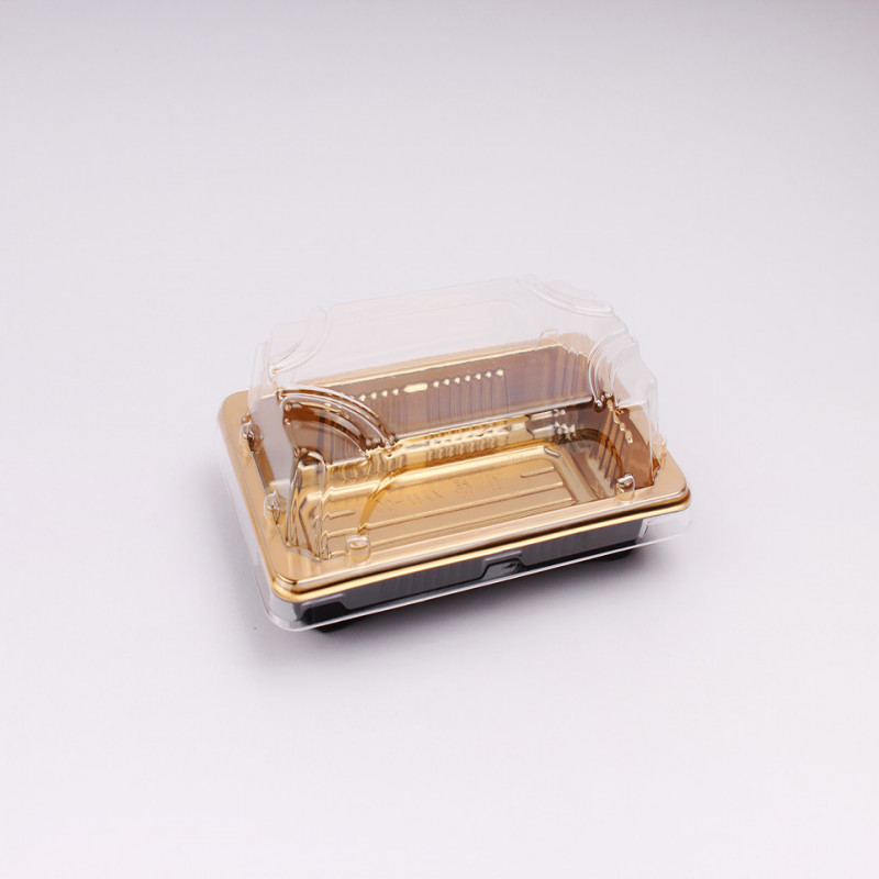 صحن سوشي ذهبي الراشد-رقم7020* ك×4ربطة×115حبة , صحن بلاستيك لون ذهبي بغطاء شفاف يستخدم للسوشي والكوكيز والحلويات .