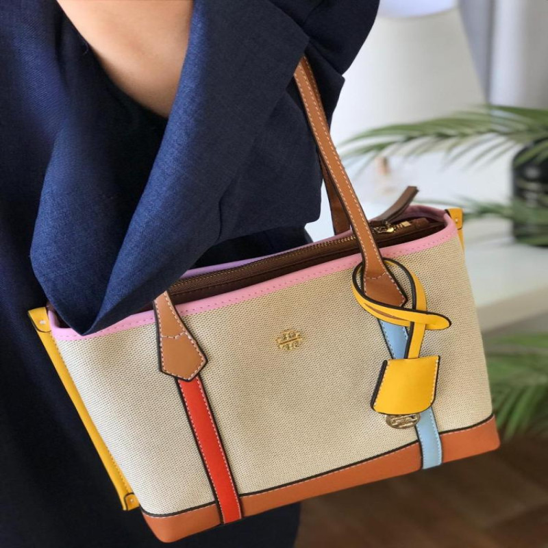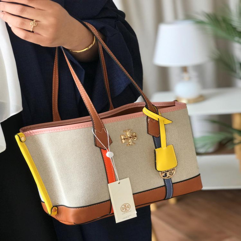 شنطة توري بورش بألوان جريئة وجميلة، مزيج بين القماش البيج الفاخر وجلد ملون بأطراف متعددة (أصفر، بني، وردي، أزرق، وبرتقالي). تصميم أنيق وعصري يناسب الطلعات اليومية والمناسبات الخفيفة، وتجي مع سير كتف طويل قابل للفك.