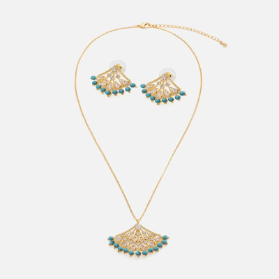 - يتميز الطقم بتصميم حلية بشكل مميز مرصعة بفصوص الزركون البراقة وبأحجار بلون أزرق فيروزي تضفي لمسة من الجاذبية