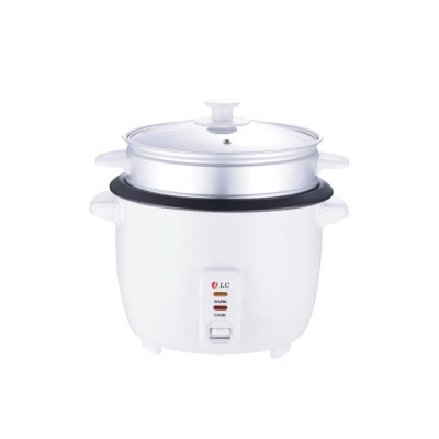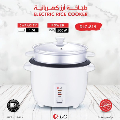 طباخة أرز كهربائية من ماركة "DLC" تتميز بتصميم كلاسيكي باللون الأبيض. تتكون الطباخة من وعاء رئيسي للطهي، مع وعاء إضافي (مصفي) يُمكن استخدامه على الأرجح لطهي الخضروات بالبخار أو تصريف السوائل، بالإضافة إلى غطاء زجاجي شفاف.