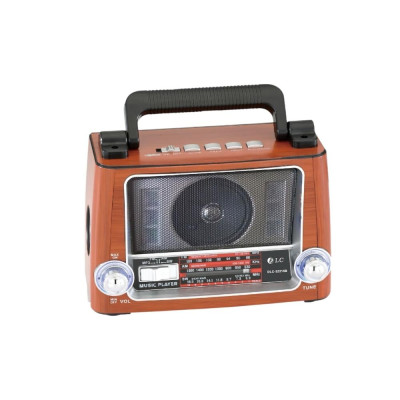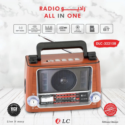 راديو بتصميم كلاسيكي أنيق مع مقبض علوي لسهولة الحمل، يجمع بين الشكل التراثي والتقنيات الحديثة.
